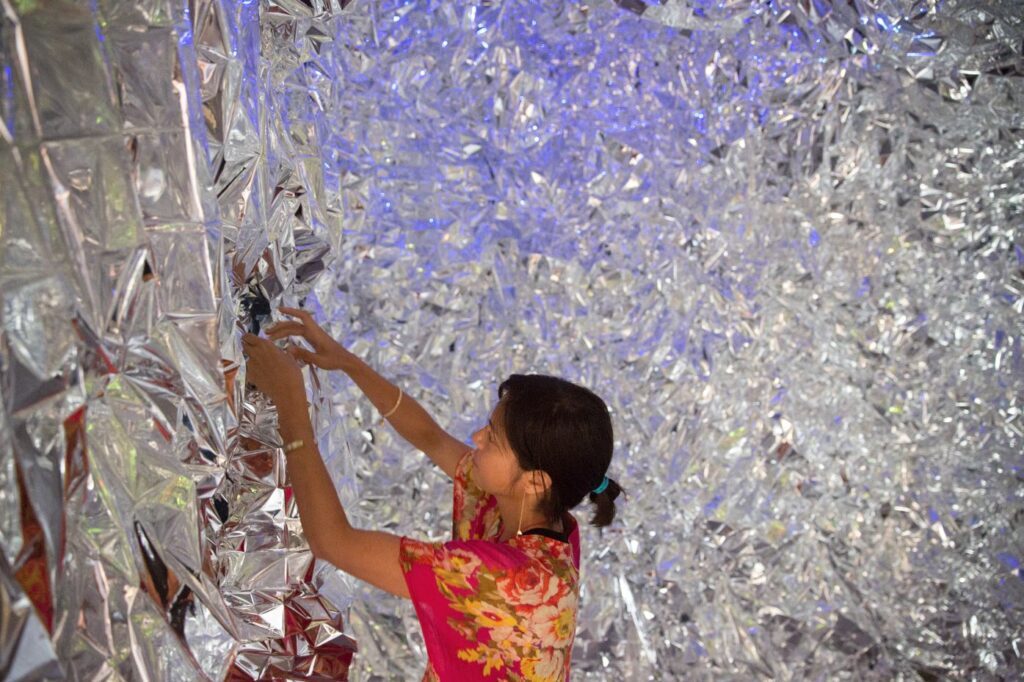 Installation artist Grace Villamil was a Spring 2023 Artist-in-Residence. In April, Villamil opened her interaural space installation inside the Barbara Boggs Sigmund Lobby of the Paul Robeson Center. Grace sculpted hundreds of emergency blankets to transform our space into a completely different world. Villamil’s art is driven by her interest in perception, our interconnected nature, and the shared experience. Through the synthesis of sound, light, environment, and material, she explores an idea of mysticism: the boundaries of humanity and the uncertainty beyond it. Grace’s multimedia mylar installations are large-scale, interactive environments sculpted with emergency blankets, creating spaces of reflection within a womb-like environment. These environments encourage the public to sense beyond their accustomed function and assumed limitation. The functionality of these installations eschew the behavioral and intellectual conventions associated with galleries and museums. This installation acts as a bridge or meeting place between the communities of Princeton; connecting and creating space for new possibilities to occur.