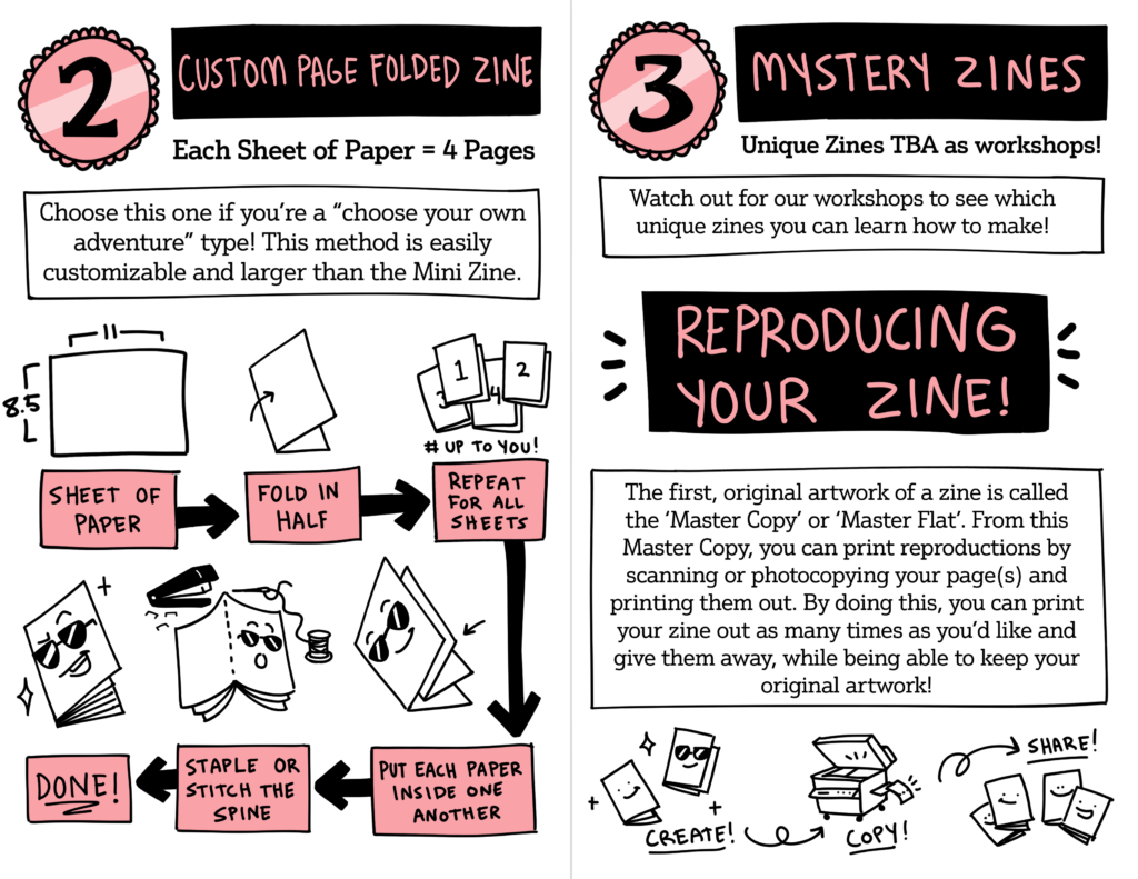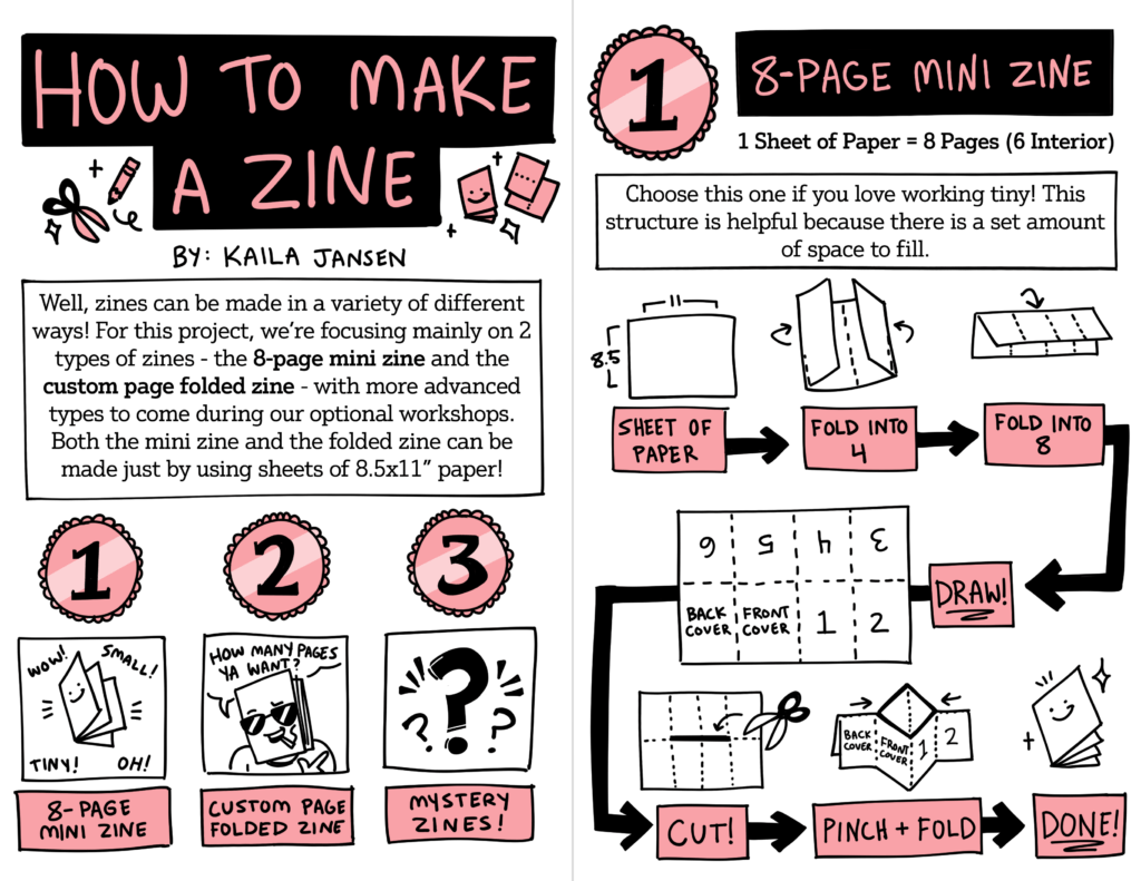 Well, zines can be made in a variety of different ways and you are welcome to create yours however you’d like. Great options for beginners are the 8-page mini zine and the custom page folded zine. Both the mini zine and the folded zine can be made just by using sheets of 8.5×11” copy paper.