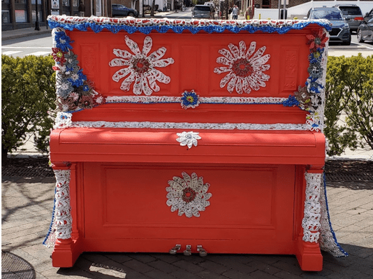 All of our work has been on a smaller scale, however the two projects that the ACP asked Naomi and I to work on were on a much larger scale! We covered a full upright piano (and stool) with crocheted recycled plastic bags for our April Arts Piano Project. Our second project was to decorate a 4+ foot tall Skull for our Day of the Dead festival.